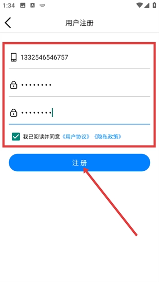 4、用户注册时,需在注册页面填写11位中国大陆手机号,设置并确认纯数字密码,勾选同意《用户协议》与《隐私政策》,最后点击【注册】按钮即可完成注册流程。