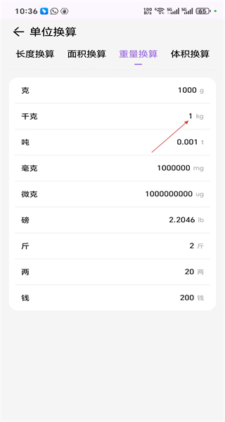 4、接着切换至重量换算页面,把数值设定为1千克,然后查看该数值在克、吨、毫克等其他重量单位下的换算结果。