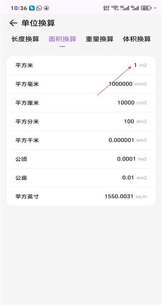 3、切换至面积换算页面,将数值设定为1平方米,查看该数值在平方毫米、平方厘米等其他面积单位下的对应换算结果。