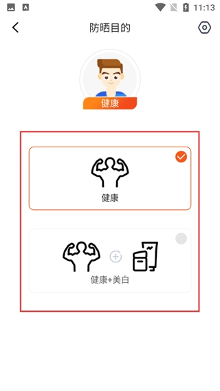 3、进入【防晒目的】选择界面,这里提供【健康】和【健康+美白】两种选项,根据自身需求选择后,应用便会匹配对应的防晒策略。