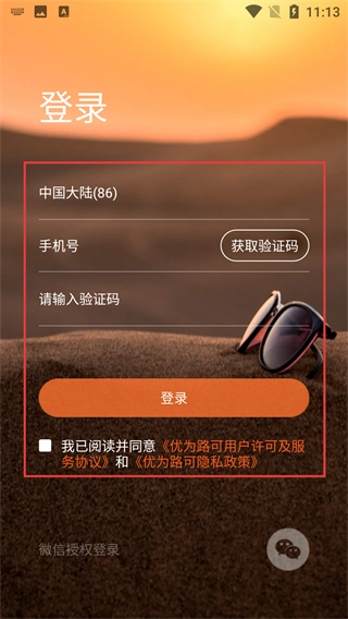 4、进入登录页面后,先选择地区为【中国大陆(86)】,接着输入手机号并点击获取验证码,勾选同意相关协议后点击【登录】按钮即可完成登录;此外,也可以通过微信授权的方式进行登录。