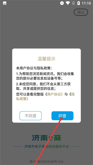 1、仔细阅读【用户协议】和【隐私政策】的具体内容,在确认无误后点击【同意】按钮,即可进入济南市电子商务公共服务平台的界面。