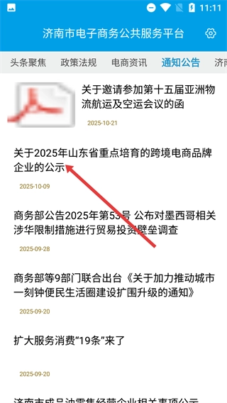 3、在【通知公告】列表页面中,找到并点击【关于2025年山东省重点培育的跨境电商品牌企业的公示】这一公告,即可进入该公告的详情页面。