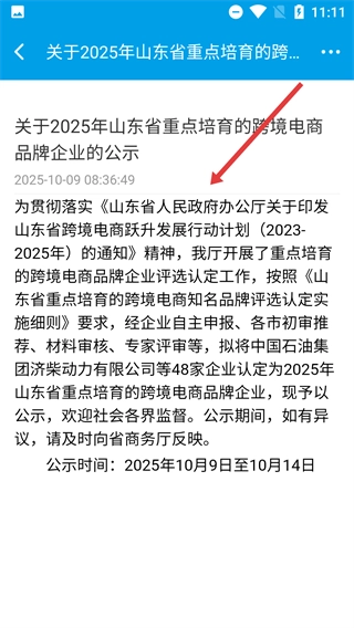 4、进入公告详情页面后,查看该公示的具体内容,从中了解2025年山东跨境电商品牌培育相关的认定企业、公示时间等信息。