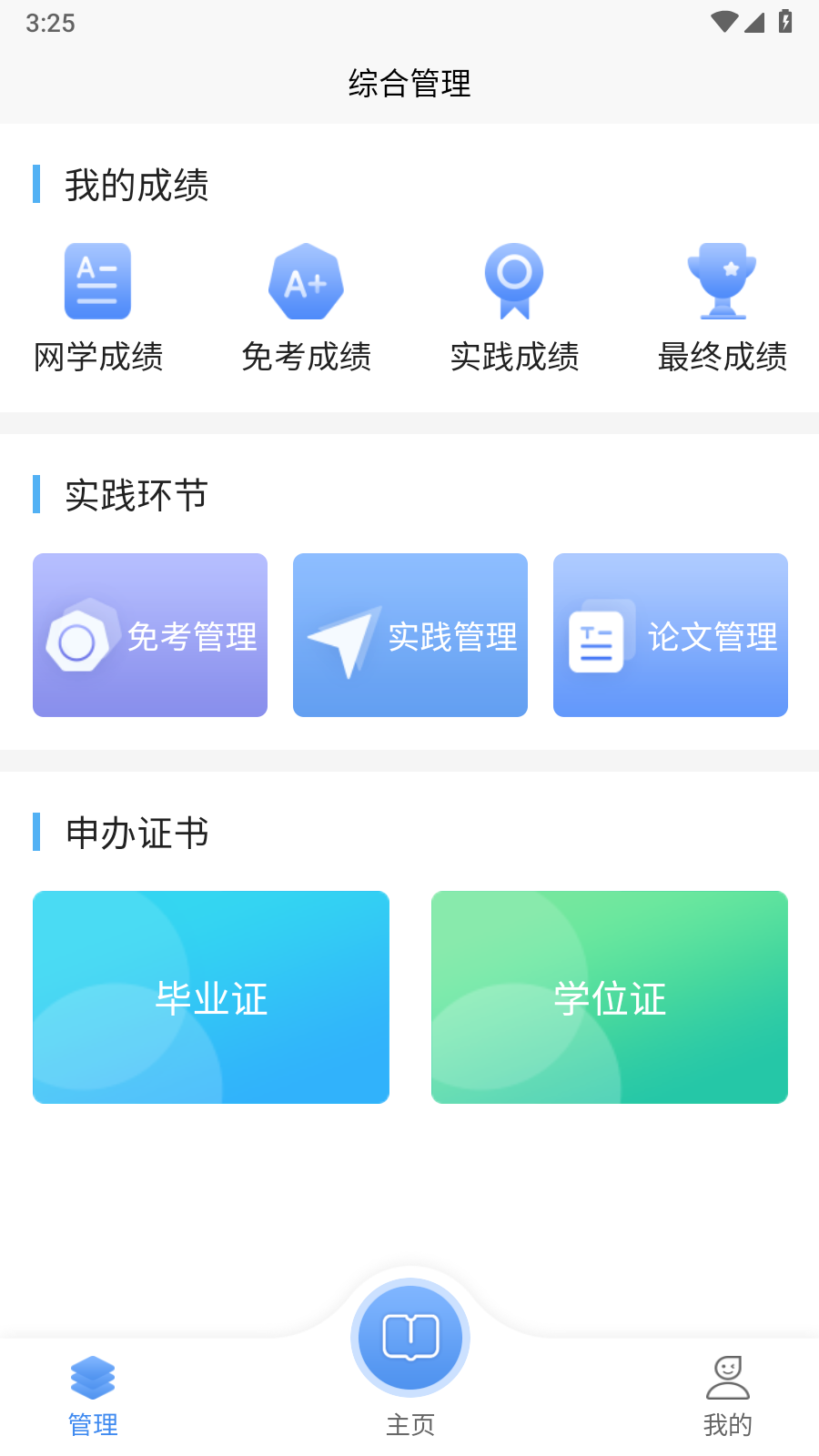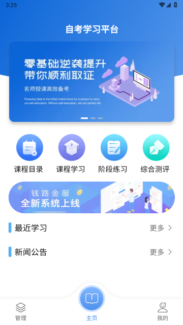 1启动自学考试的在线学习应用后,在主界面能找到课程分类列表与综合评估模块。