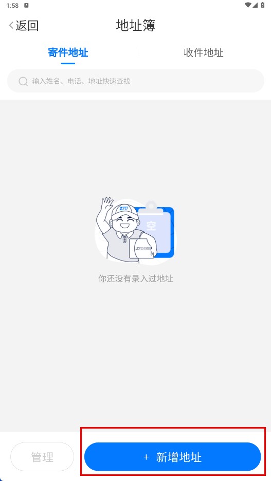 2、要是地址簿里没有地址,点击【+新增地址-功能按钮】来添加寄件地址或者收件地址。