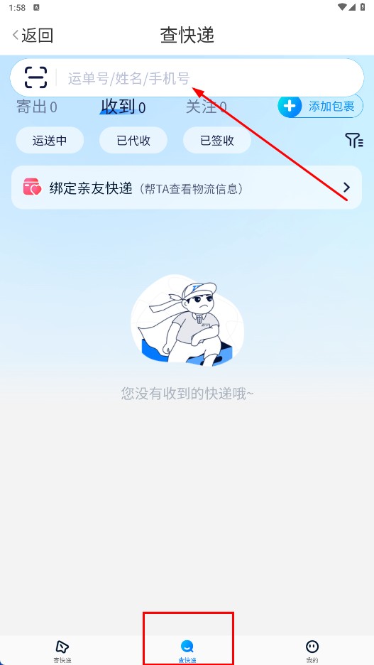 4、如需查询快递,可点击底部的【查快递-功能按钮】进入查快递页面,在搜索框中输入运单号、姓名或手机号,即可查询到快递物流信息。