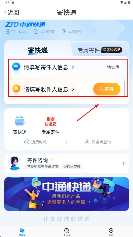 1、进入寄快递页面,依次填写好寄件人信息与收件人信息后,点击页面上的【去寄件】功能按钮。
