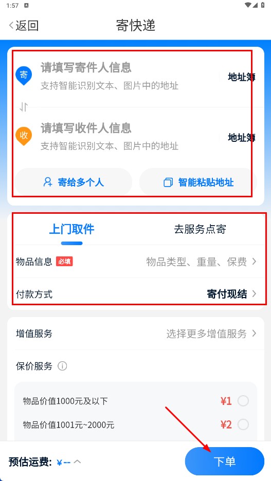 3、填写寄件人和收件人的信息,选择上门取件或前往服务点寄送,完善物品详情、付款方式等内容后,点击【下单】功能按钮,即可完成寄件订单的提交。
