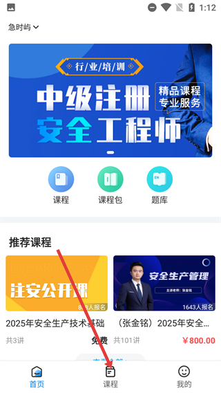 1、进入中级注册安全工程师培训首页后,点击底部导航栏中的【课程】选项,即可进入课程列表页面。