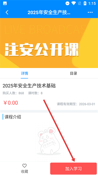2、进入课程列表页面后,找到并选择你想要学习的目标课程(例如《2025年安全生产技术基础》),随后即可进入该课程对应的详情页面。