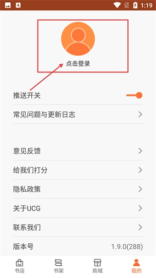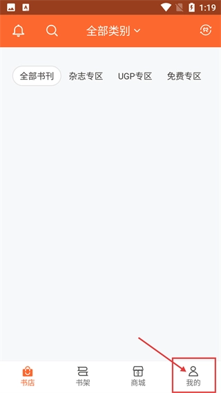 1、进入书店界面后,点击底部导航栏里的【我的】选项,就能进入个人中心页面,在该页面可以查看设置、反馈等功能的入口。