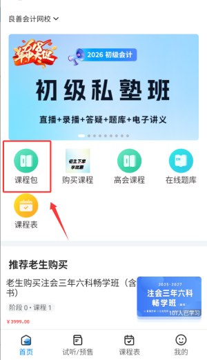 1、打开良善会计平台后,在首页的导航栏中找到并点击“课程包”板块,该板块汇集了多种会计培训课程供用户浏览。