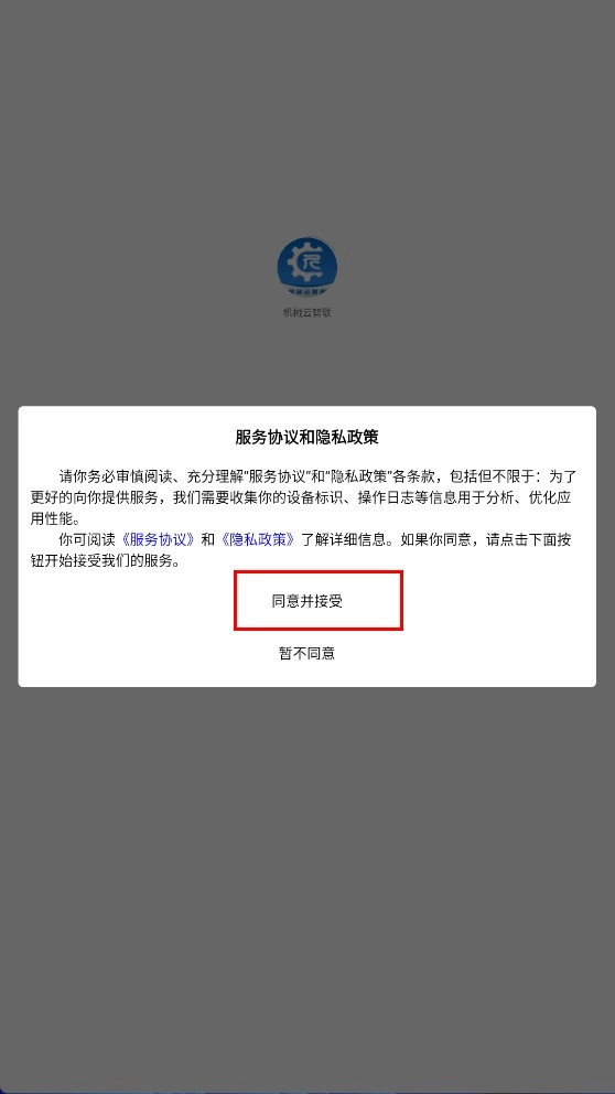 1、在服务协议界面,点击【同意并接受】,确认平台的服务条款与隐私政策。