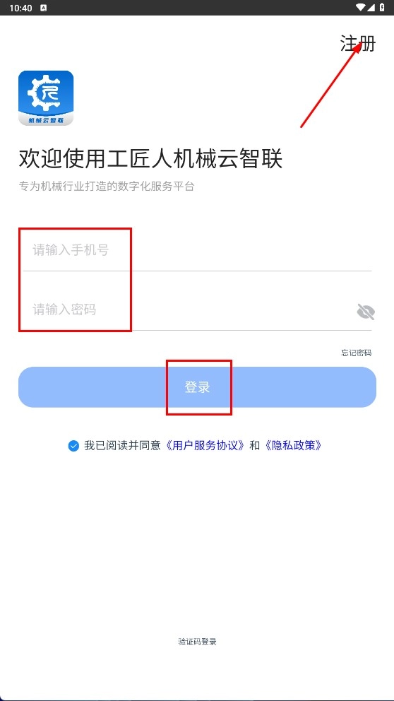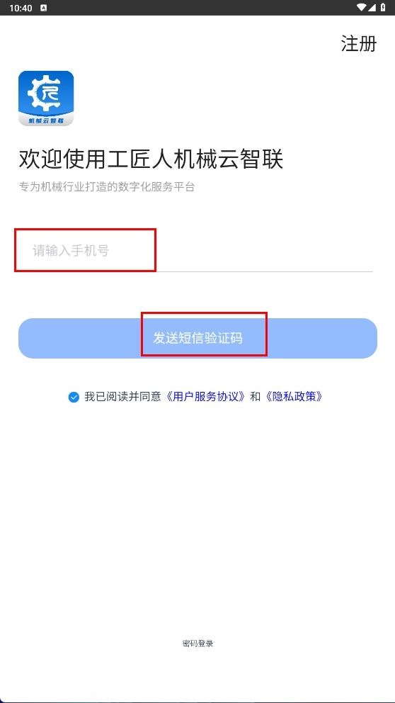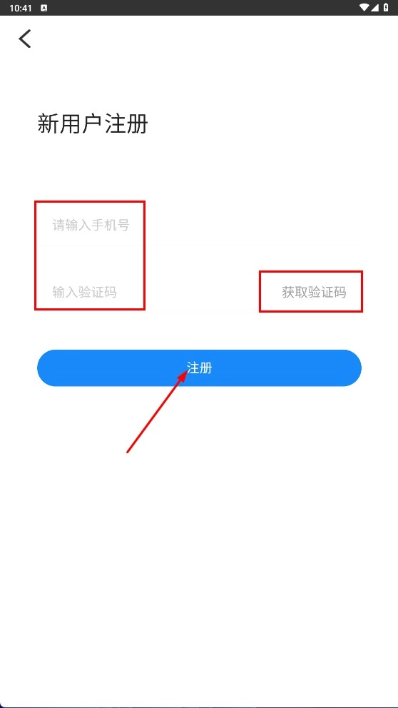 4、新用户注册时,填写手机号、获取并输入验证码,点击【注册】完成账号创建。