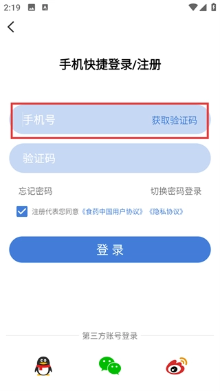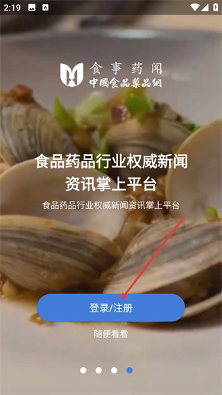 1、在【食事药闻】应用启动页点击【登录/注册】按钮,进入手机快捷登录-注册界面。