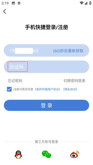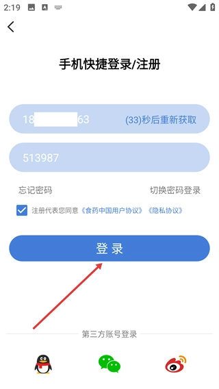3、在验证码输入框填写收到的内容,确认【用户协议-隐私政策】已勾选。