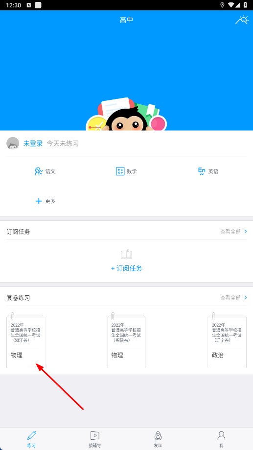 3、来到高中学习页面,选择套卷练习,如【2022年普通高等学校招生全国统一考试(浙江卷)物理-套卷名称】。