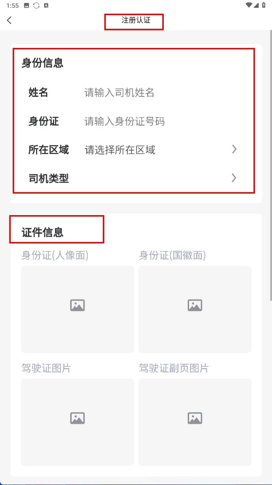 3、在注册认证页,依次填写身份信息(姓名、身份证等),并上传证件信息(身份证、驾驶证相关图片)。