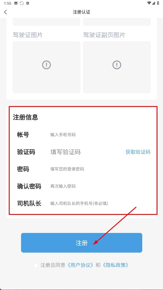 4、填写注册信息(账号、验证码、密码等),勾选协议后点击【注册】,完成司机账号的注册认证。