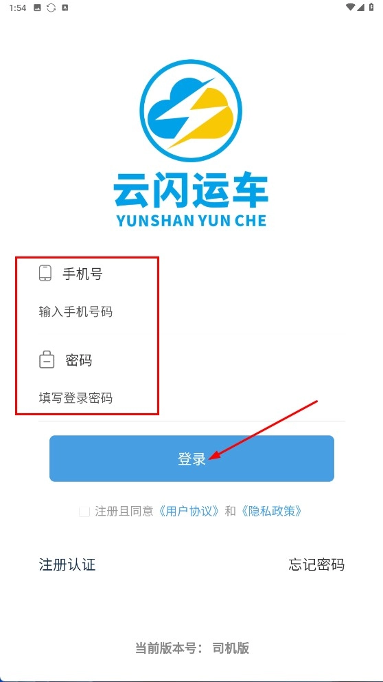 2、在“云闪运车”登录页,输入手机号和密码,勾选协议后点击【登录】,完成账号登录。