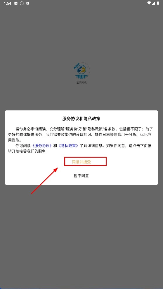 1、在服务协议和隐私政策弹窗,点击【同意并接受】按钮,确认协议条款,进入应用后续流程。