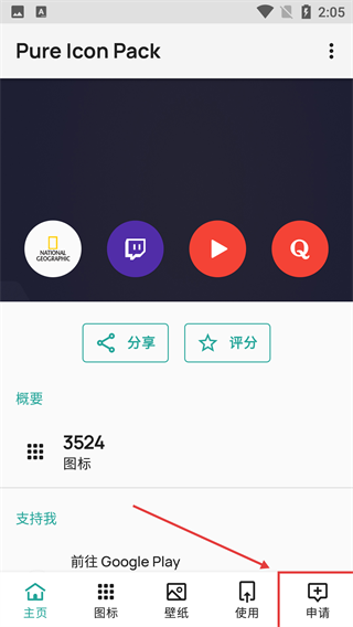 1、进入【Pure-Icon-Pack】界面,可查看含【3524-图标】的概要,底部有【主页】-【图标】等功能,点击【申请】可进入对应页面。