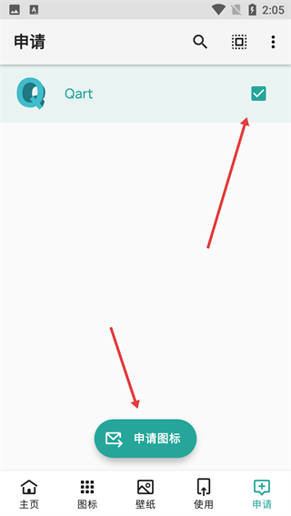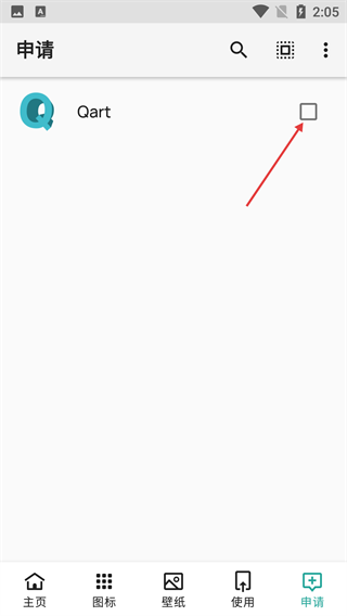 2、在【申请】页面找到目标应用【Qart】,点击其右侧的选择框,即可选中该应用以进行后续的图标申请操作。