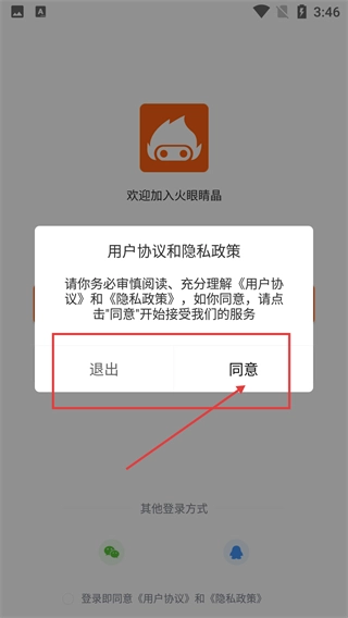 1、进入【火眼睛晶】后,阅读【用户协议】和【隐私政策】,点击【同意】按钮,即可进入后续登录流程。