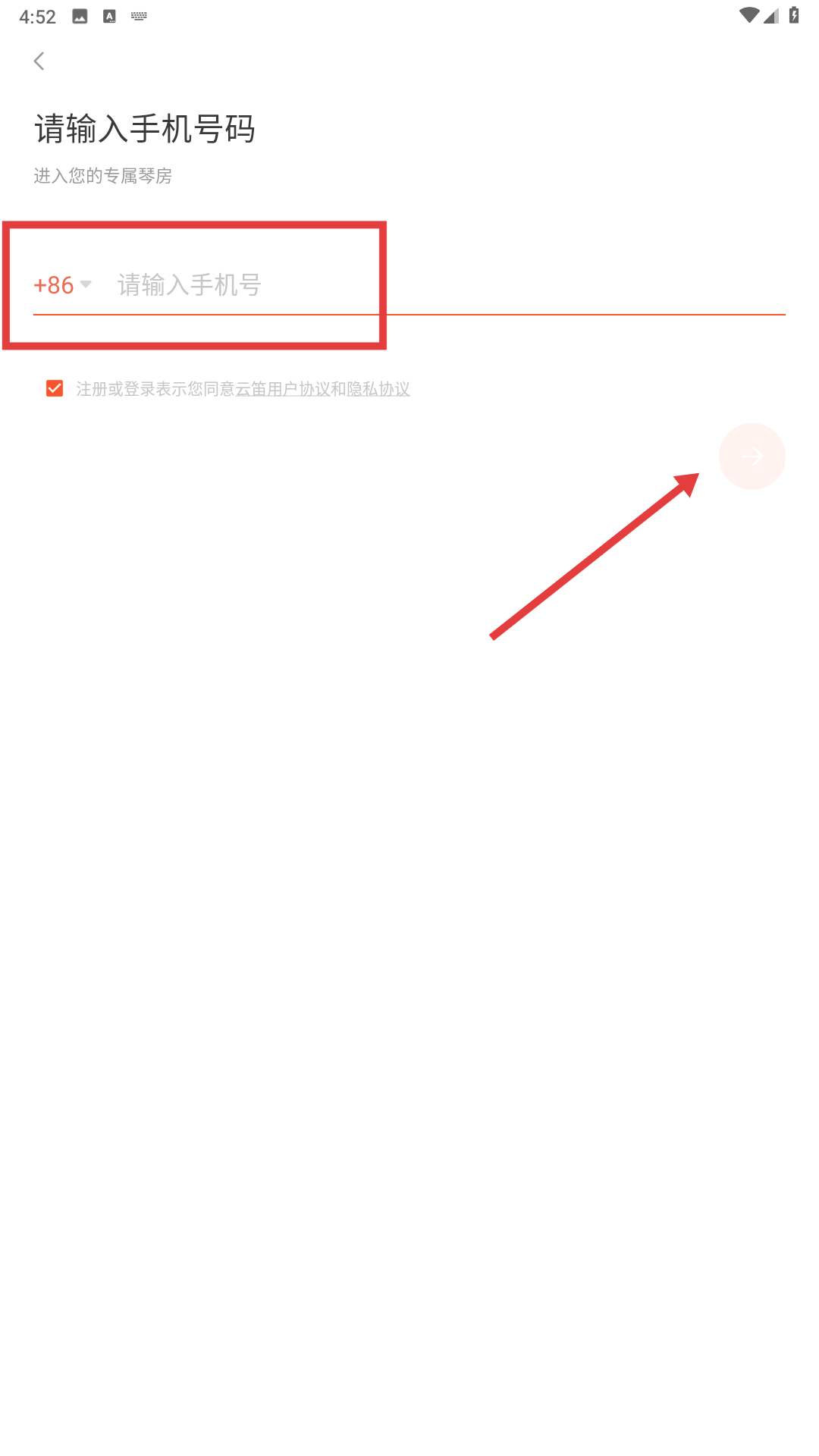 3、在手机号输入页,填写【请输入手机号-输入框】,并确认协议勾选。