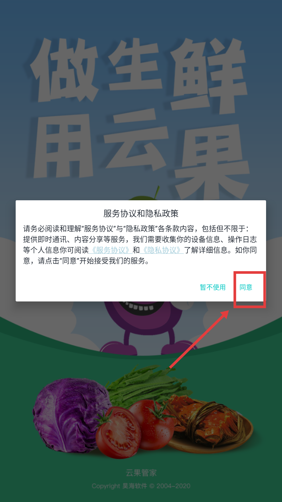 1、进入应用时,阅读《服务协议》与《隐私政策》,点击【同意】按钮,接受条款以继续使用。