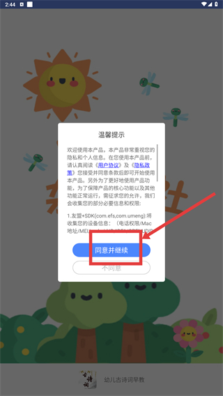 1、在温馨提示弹窗中,点击【同意并继续】功能按钮,即可进入后续页面。