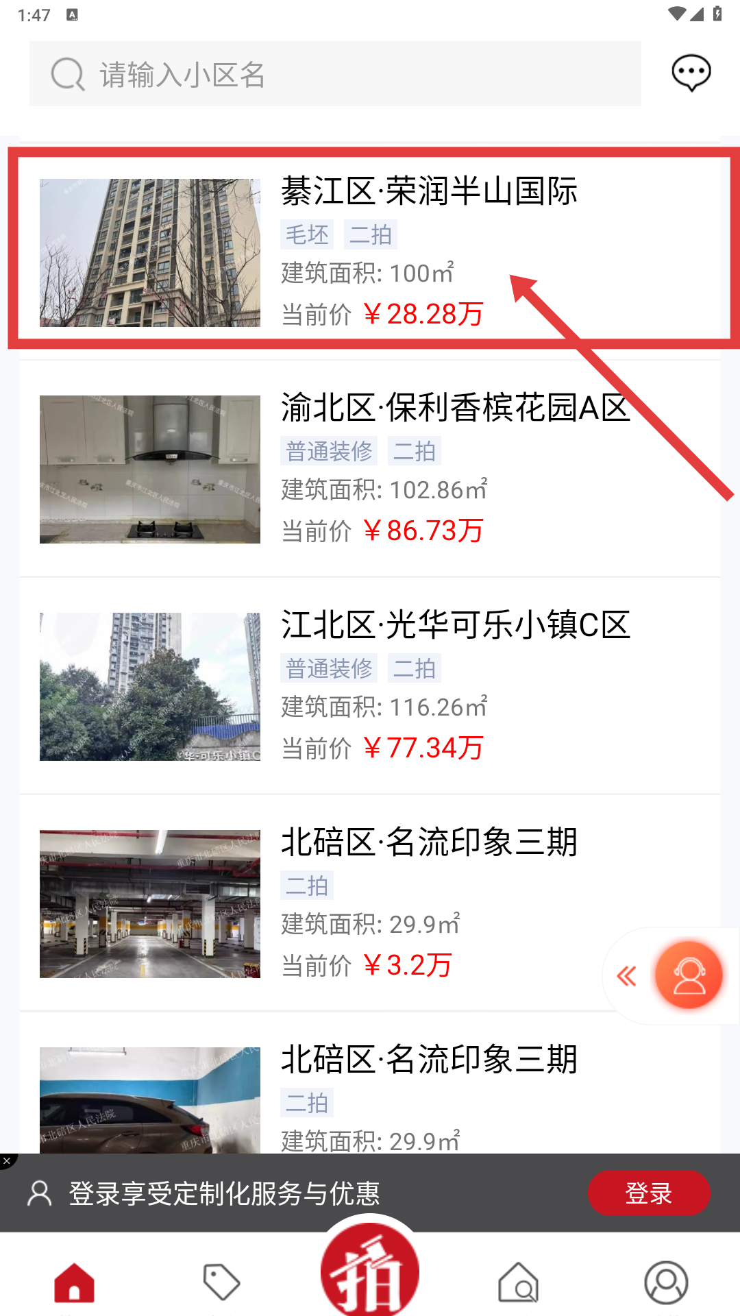 2、在房源列表,选择目标房源(如“綦江区·荣润半山国际”),点击房源卡片进入详情页。