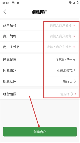 4、进入创建商户的界面后,填写【商户名称】【商户简称】等必须填写的信息,确认无误后点击【创建商户】按钮,即可完成商户信息的提交。
