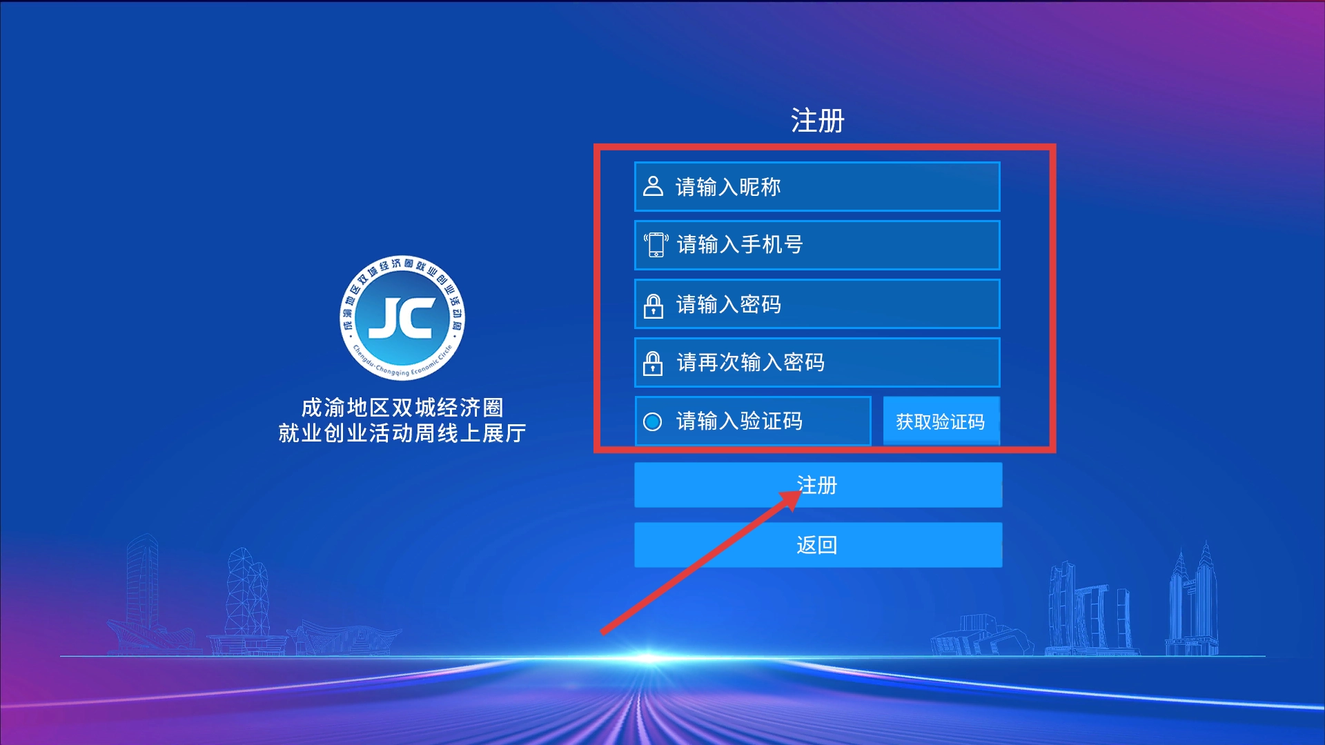 4、进入注册页面后,需按顺序填写昵称、手机号,两次输入密码,接着获取并填写验证码,最后点击【注册】功能按钮,即可完成账号注册。