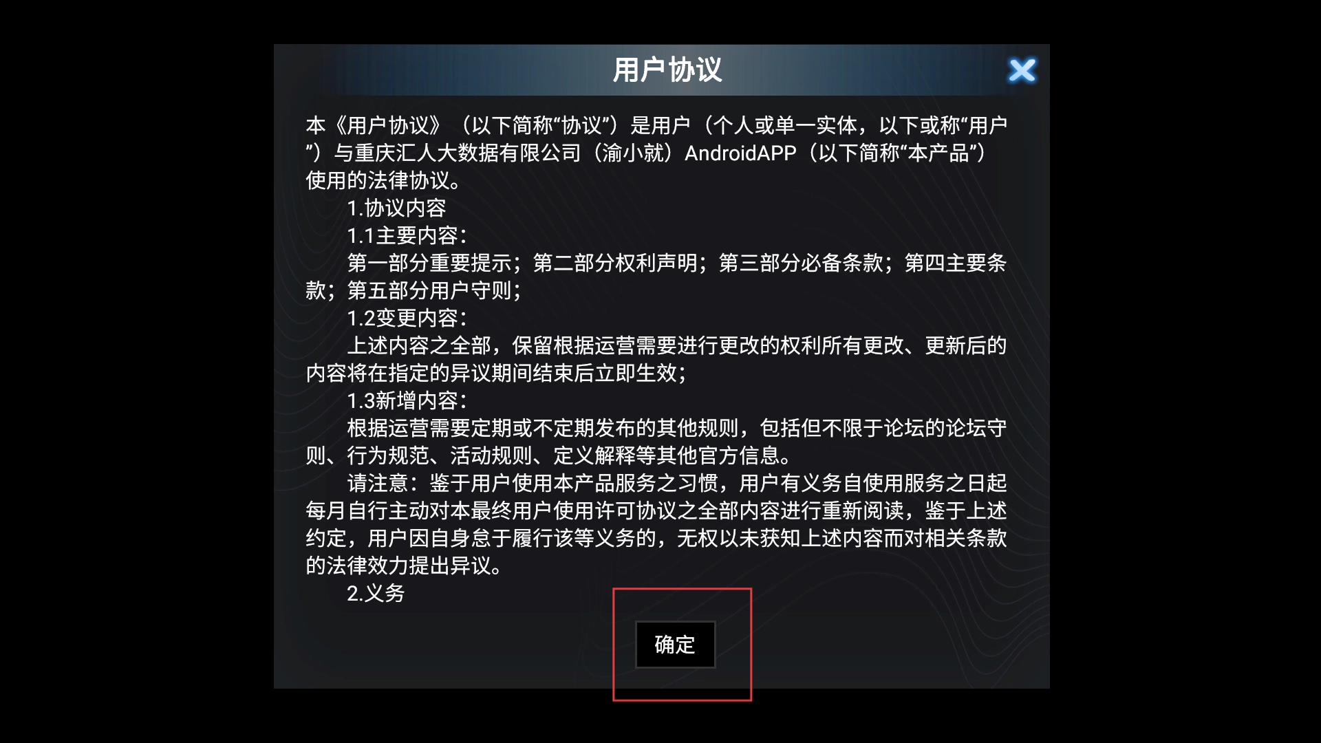 2、进入用户协议详情页面后,再次点击【确定-功能按钮】,即可完成协议确认流程。