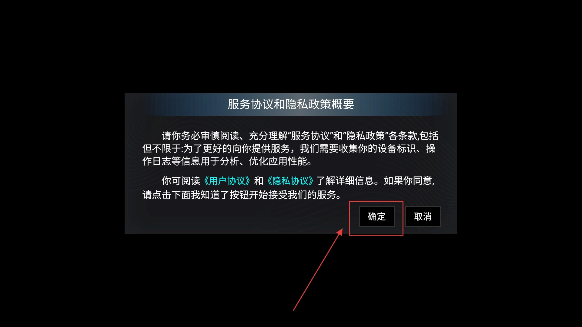 1、当弹出服务协议与隐私政策的概要窗口时,点击【确定】功能按钮,以此确认同意并接受相关条款。