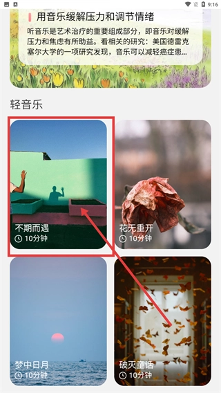 1、在首页找到并点击【轻音乐】功能图标,进入轻音乐页面后,就能通过音乐来调节自己的情绪了。