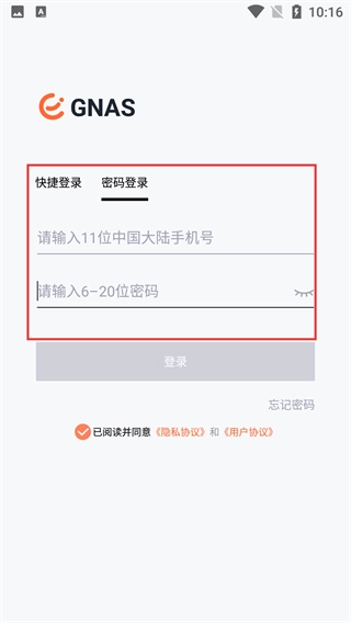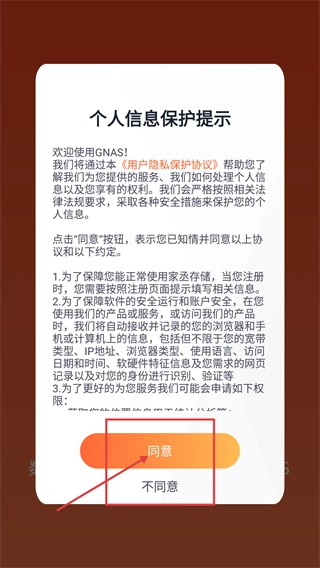 1、打开GNAS应用后,会出现【个人信息保护提示】弹窗,必须点击【同意】按钮进行确认,方可进入后续的登录环节。