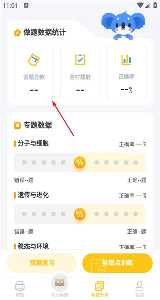 4、进入易错分析页面,查看做题数据统计内容,浏览各专题数据,点击错题复习按钮。