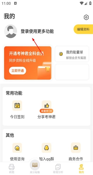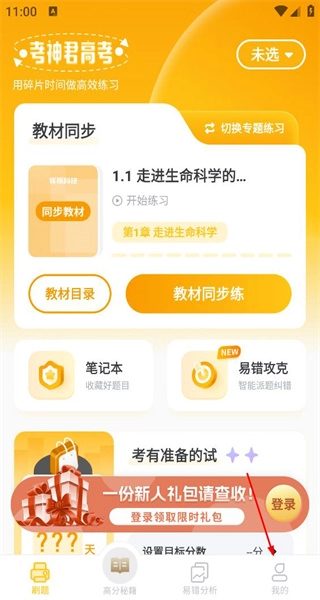 打开软件后,先浏览教材同步等功能板块,接着点击底部的“我的”按钮,即可进入与个人相关的页面。