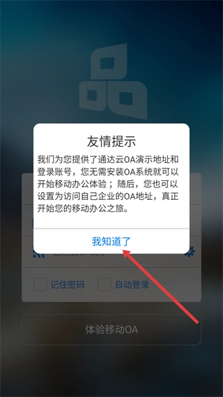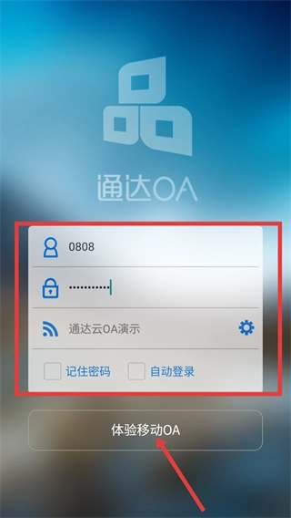2、在登录界面确认已填写的【账号】【密码】及【服务器】信息准确无误后,点击【体验移动OA】按钮,即可进入通达云OA的演示办公系统。