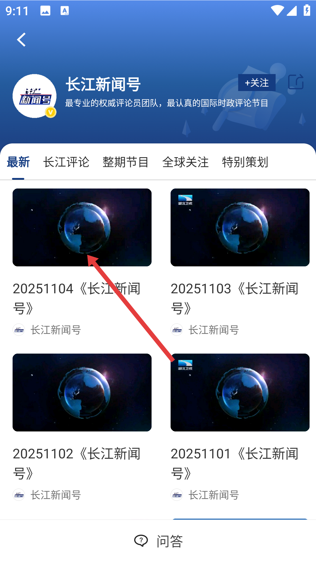 3、进入【长江新闻号】页面后,选择想要查看的节目,如【20251104《长江新闻号》】并点击。
