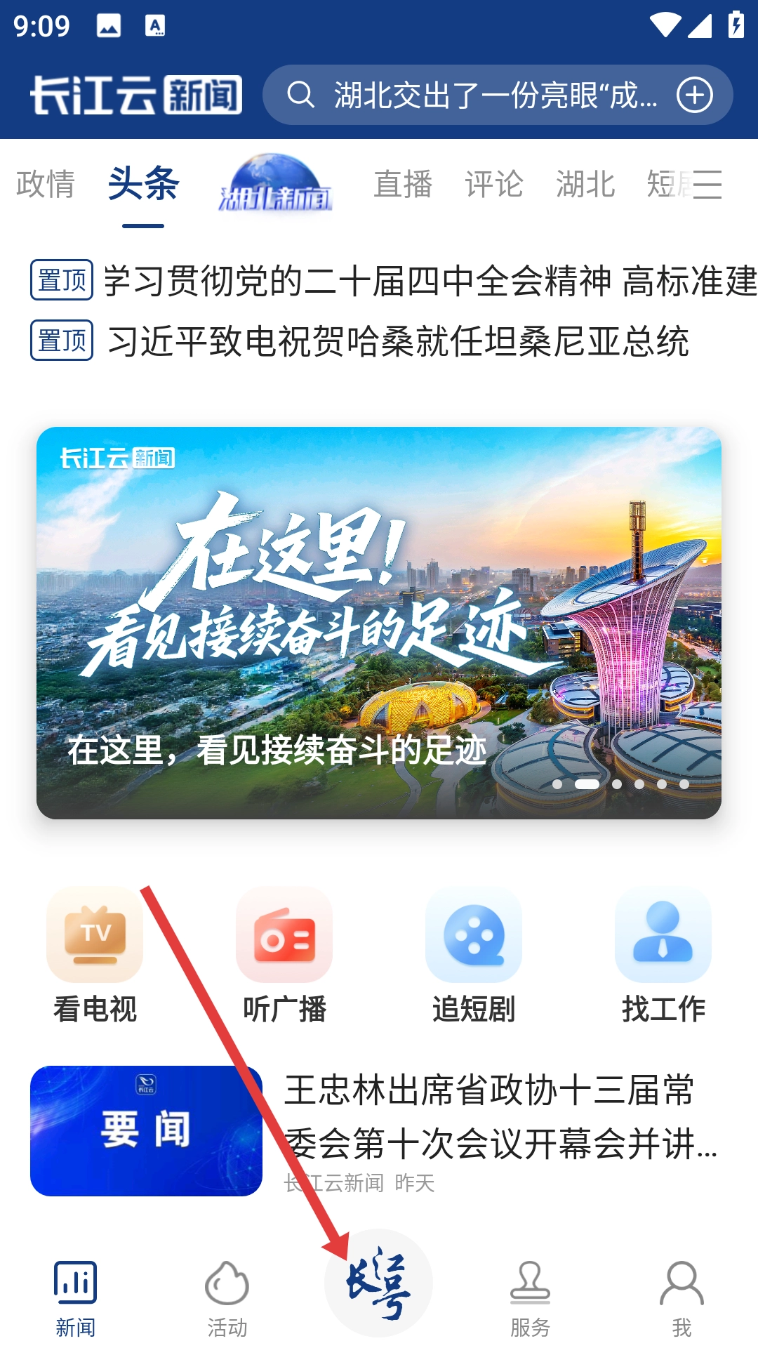 1、打开后进入【新闻】页面,点击底部导航栏的【长江号】,进入长江号页面。