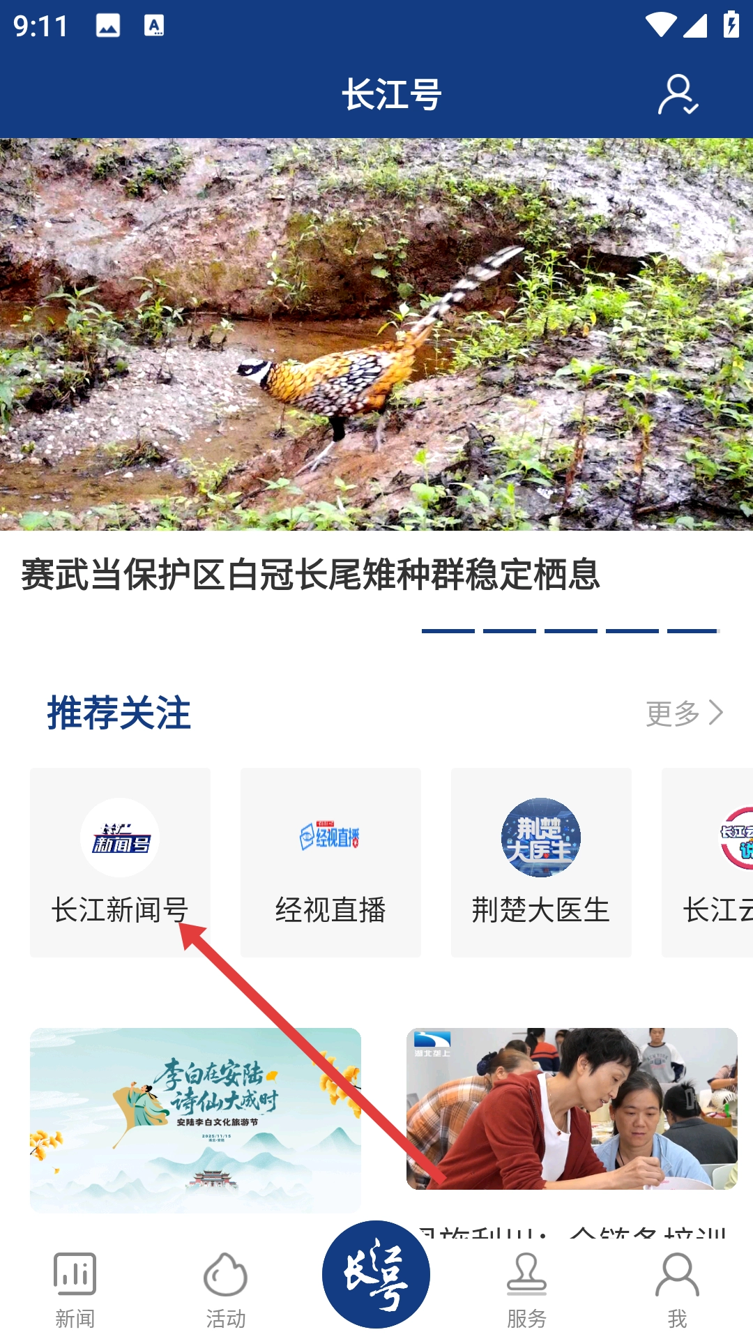 2、在【长江号】界面,找到【推荐关注】板块中的【长江新闻号】并点击。