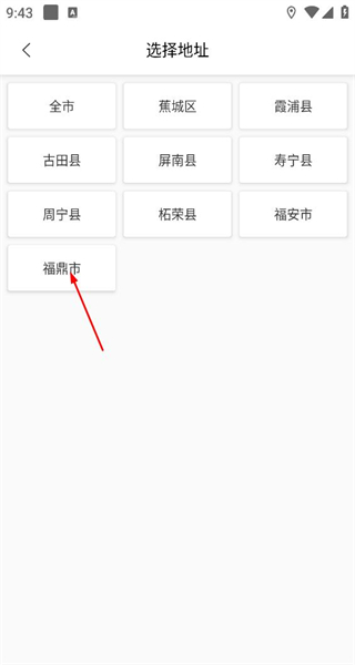 3、进入福建省的城市选择页面,浏览各城市选项后选定宁德市,接着进入该市的区县选择界面。