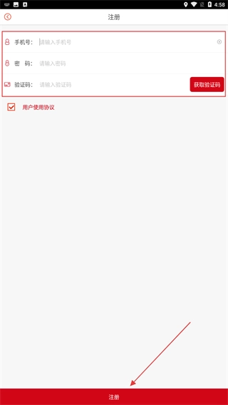 2、进入注册页面后,依次填写手机号、密码,获取并输入验证码,勾选协议后点击【注册】完成账号注册。