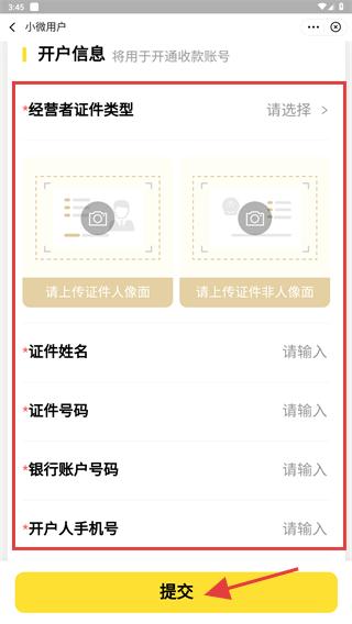 3、进入开户信息页,选择【经营者证件类型】,上传证件人像面与非人像面,填写证件及银行信息后点击【提交】。
