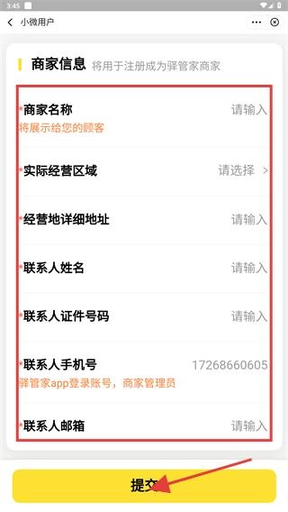 2、在小微用户的商家信息页,填写【商家名称】【经营区域】等必填项,完成后点击【提交】。