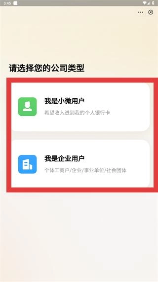 1、依据自身属性,选择【我是小微用户】或【我是企业用户】,进入对应商家注册流程。